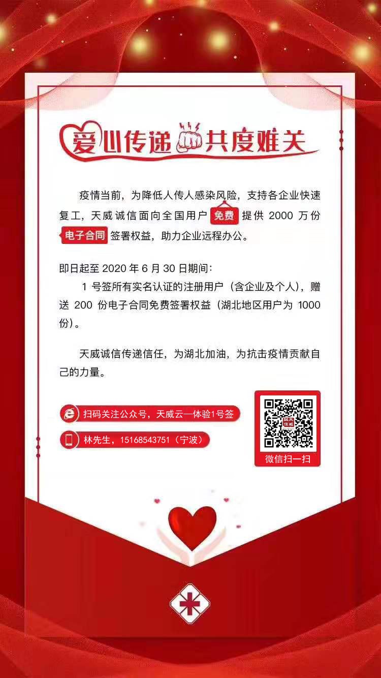 因此,为降低人传人感染风险,支持各企业快速复工,天威诚信面向全国用户,免费提供2000万份「不出差、不见面、不邮寄、不接触,全流程线上签署」的电子合同签署权益。
